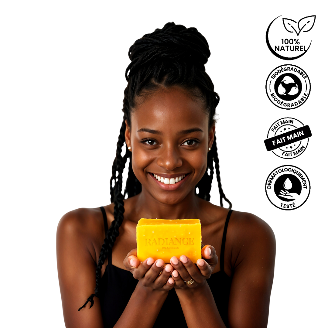 🧡 Curcuma: Il unifie le teint et atténue les taches foncées et l'hyperpigmentation grâce à son action antioxydante et rééquilibrante.
